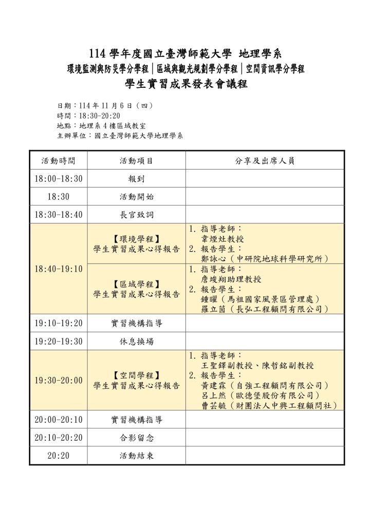 【實習】環境監測與防災學分學程|區域與觀光規劃學分學程|空間資訊學分學程 學生實習成果發表會(114/11/6) 環境監測與防災學分學程|區域與觀光規劃學分學程|空間資訊學分學程 學生實習成果發表會 報名:https://forms.gle/qfQkhaRP6Q34i3wW7 Post author:may Post published:2025-10-15