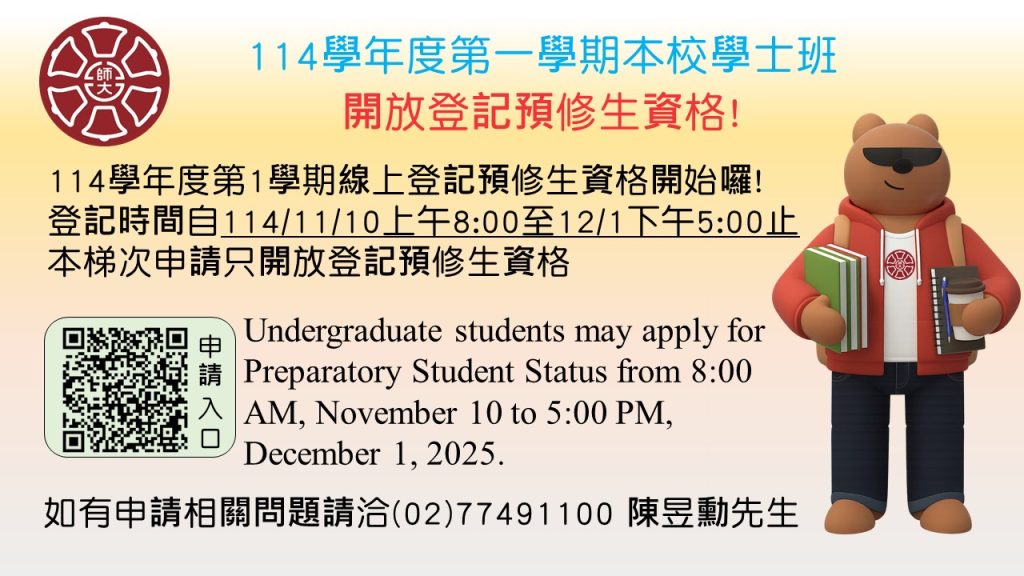 【教務】本校學士班學生登記預修生資格(114/11/10上午8時至114/12/1下午5時止) 本校學士班學生修習且通過加修學系之輔系或雙主修課架內先修課程者,可申請登記為該學系預修生。 旨揭期程僅開放登記預修生資格,不開放轉系、雙主修、輔系甄選,申請結果於114年12月15日開放查詢。 Post author:may Post published:2025-11-10
