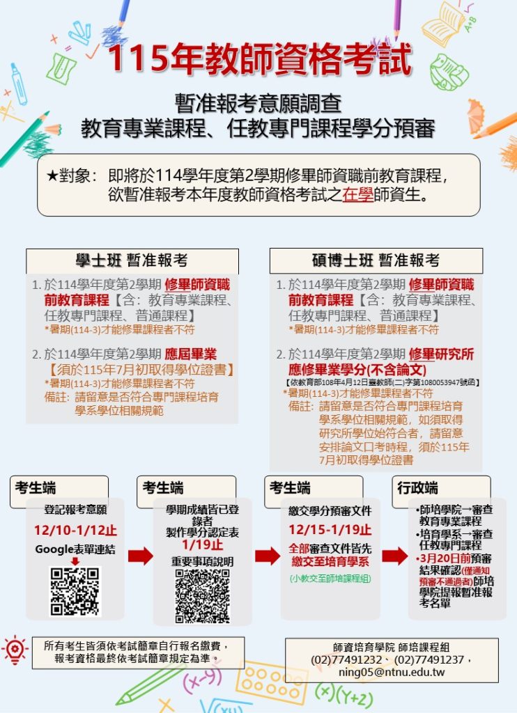 115年教師資格考試暫准報考意願調查暨學分預審已公告至師培學院官網(https://tecs.otecs.ntnu.edu.tw/page.aspx?t=news&id=555),請符合暫准報考的師資生(114-2仍在校修習最後一學期教程,且今年6月欲報考教師資格考試),一定要依時程登記暫准報考及繳交學分預審文件(未登記申請暫准報考者,不得報名參加教師資格考試)。