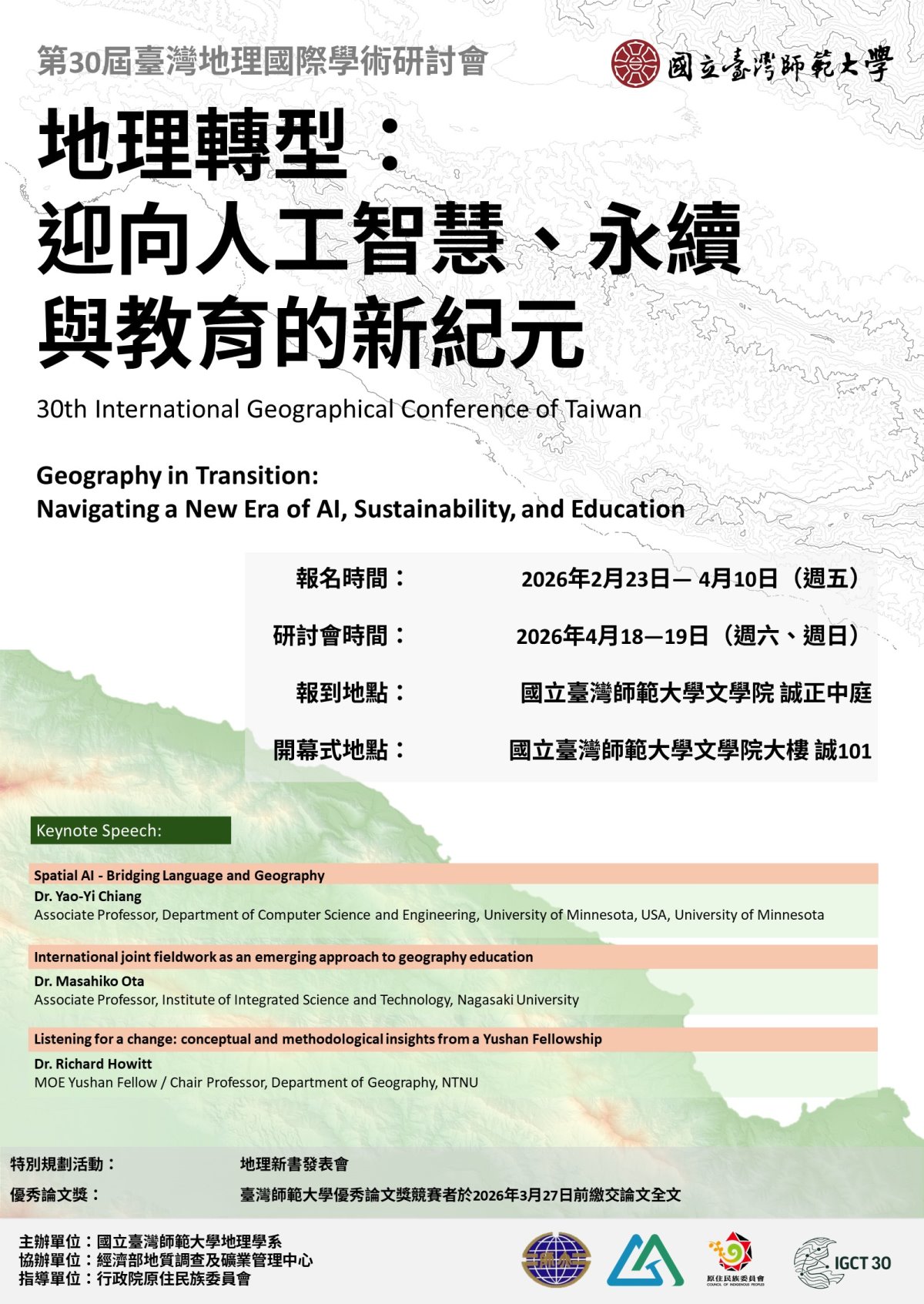 以完成付款時間為準,會議當天僅受理一般價之現場繳費如取消報名,2026年4月10日中午12:00前通知可全額退費,其後概不退費。如欲取消報名,請來信聯絡:jgctntnu@gmail.com。